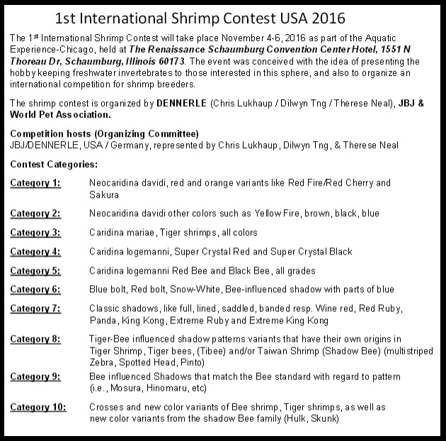 4-6 ноября 2016 В США , Чикаго , состоится Интернациональная Выставка КРЕВЕТОК - 1st International Shrimp Competition – Chicago . Выставка пройдет с экспертизой . Приглашены 5 экспертов из разных стран . Выставляемые участниками креветки , будут распределены и оценены в десяти группах(фото 3) , как и положено на выставках креветок . https://www.google.com.ua/url?sa=t&r...JyJSkZk_Sl2yKw , http://www.usashrimpcontest.com/contest/ . . . .
