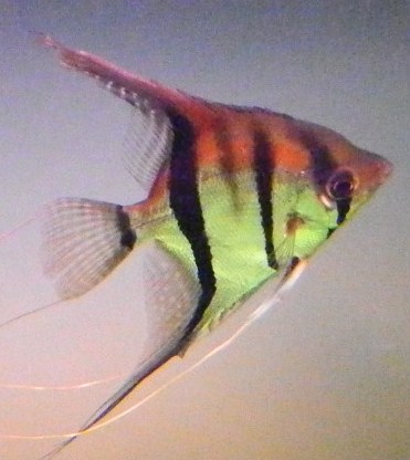 Der große Fisch ist ein Peru Skalare, wahrscheinlich Rio Nanay