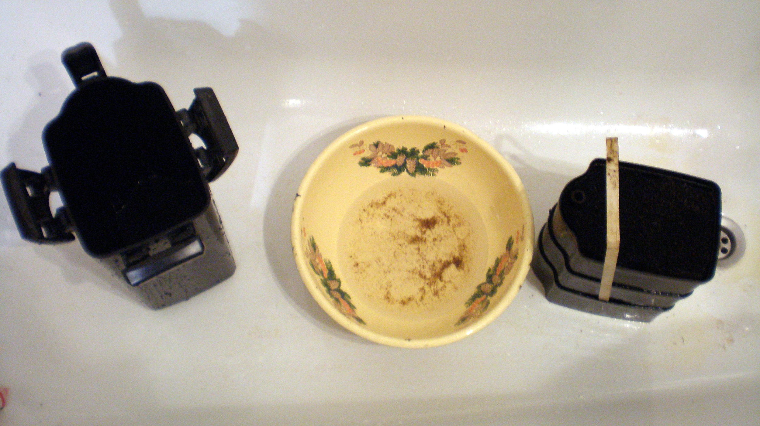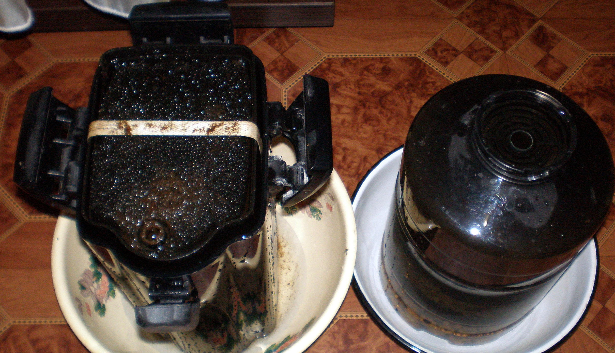Продолжение.  На все - про все, ушло немногим более часа (включая перекуры). Фильтры конечно неплохо загадились  На фото посмотрите сами. Колоний бактерий не видел, а вот результат их деятельности - смотри - не хочу  Сами фильтры хорошие. Пишу так, так как других у нас не было и не с чем сравнивать. Отказов по работе и поломок тоже не было. В обоих фильтрах убрал цеолит. В первом давно, в ASAP 800 - сегодня. Вместо него в MINIKANI 120 положил керамзит, а в ASAP синтепон. Фильтры у нас стоят на тележке с колесиками и выступающей скобой (она не позволяет тележке переворачиваться, когда на ней остается один фильтр) Ну, в общем, все
