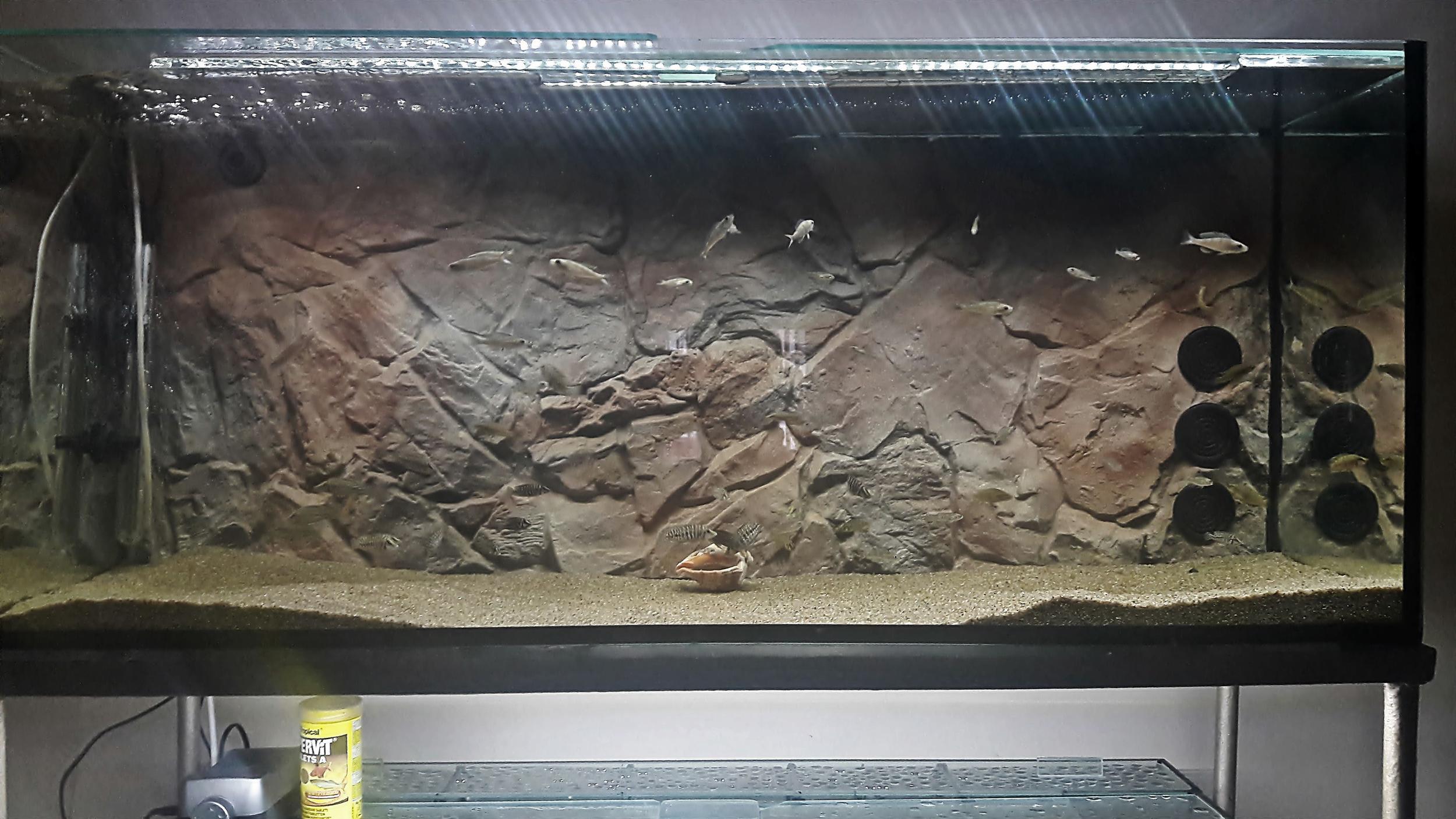 Камней пока нет, рапанов закинул. Наблюдаю как работает фильтрация, вижу , что нужно добавлять синтепон, т.к. есть мелкая взвесь, плотность рыб очень приличная для таких объемов - в верхнем 20кальвусов, 20 ципров, 10 компрессов - на 250 литров.