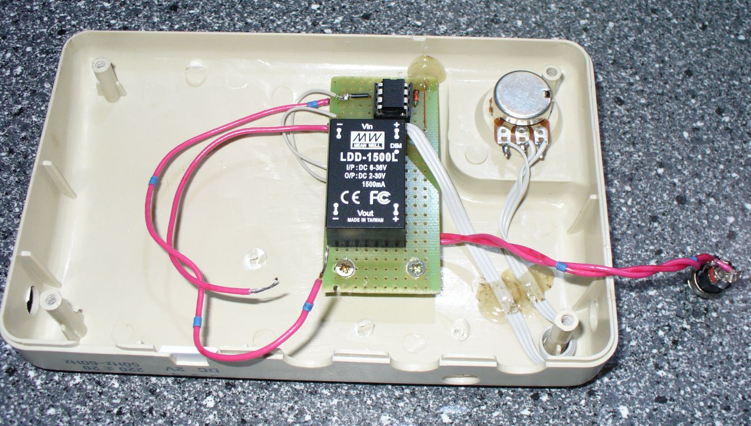 Собрано компактное устройство для питания светодиодов CREE или Prolight в составе : - драйвера 1500мА MeanWell + аналоговый ШИМ-регулятор + блок питания 2Ампера.