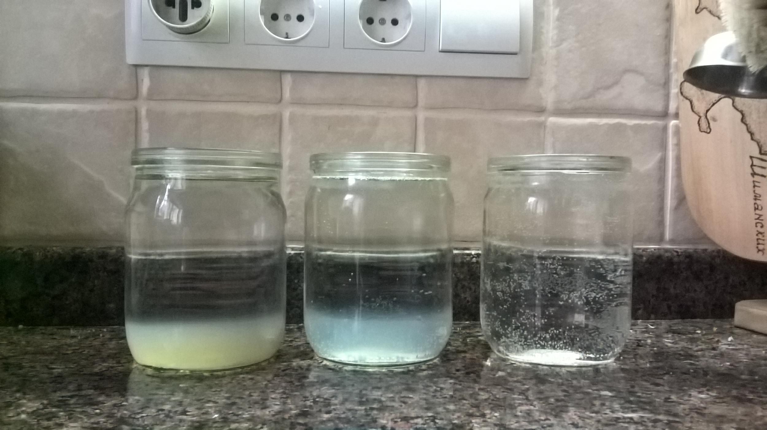 Попытался оценить как подложка красит воду. Напомню- около 1,5 см подложки под 3-5 см грунта. Слева водопровод, справа аквариумная вода. 10 дней от запуска.