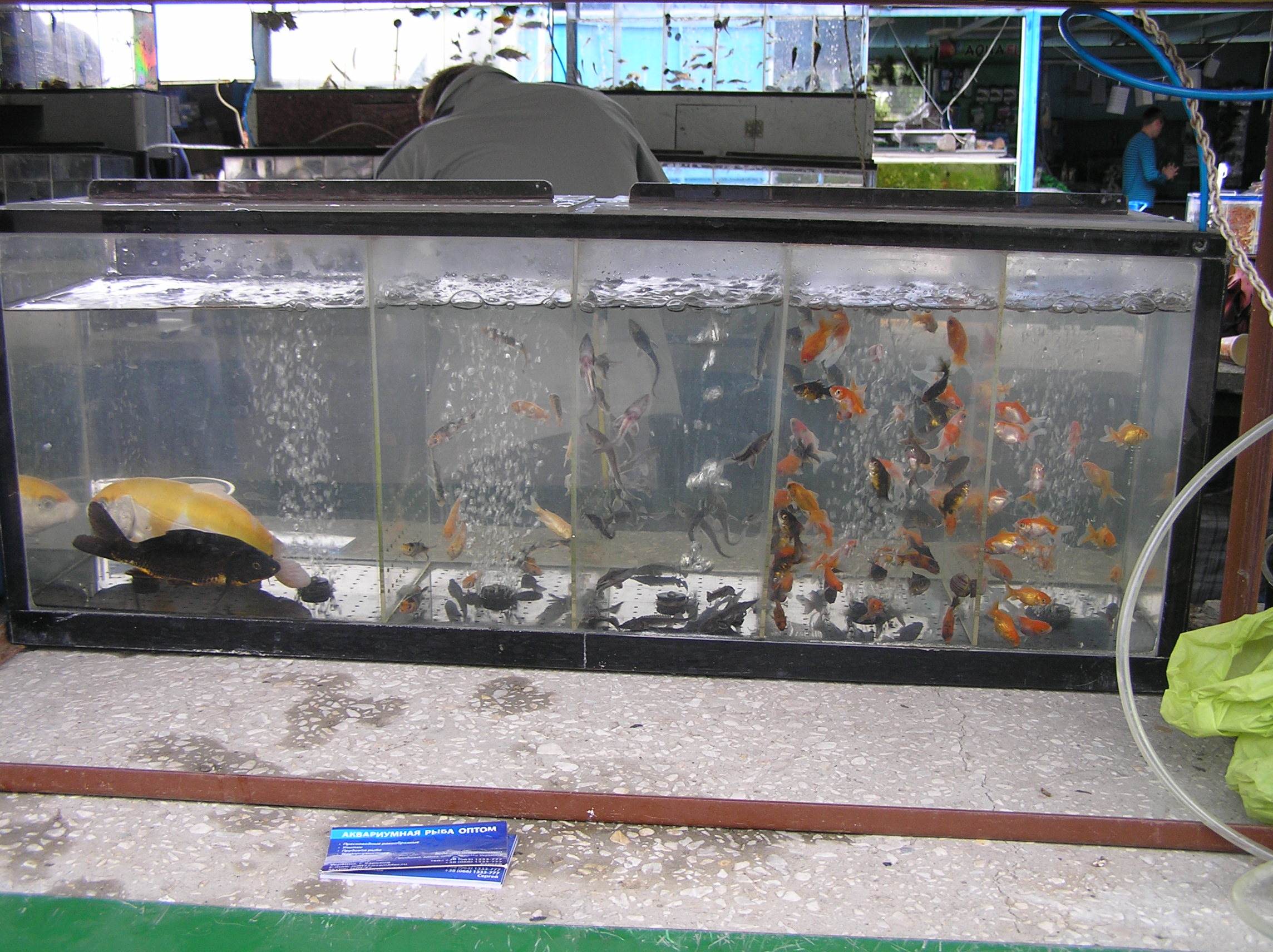 ...Был на птичьем рынке в воскресенье.К сожалению,не взял ф/аппарат.Могу сказать,что необычно много было продавцов для этого времени года.Возможно, уже харьковские разводчики наклепали столько рыбки,что вынуждены сбрасывать за недорого для освобождения емкости.Моталось и несколько оптовиков.Вы спросите,мол,откуда знаешь,что это оптовики?Есть несколько признаков.Но главный--это когда им ловят рыбку и считают,а затем вяжут резинкой кульки.