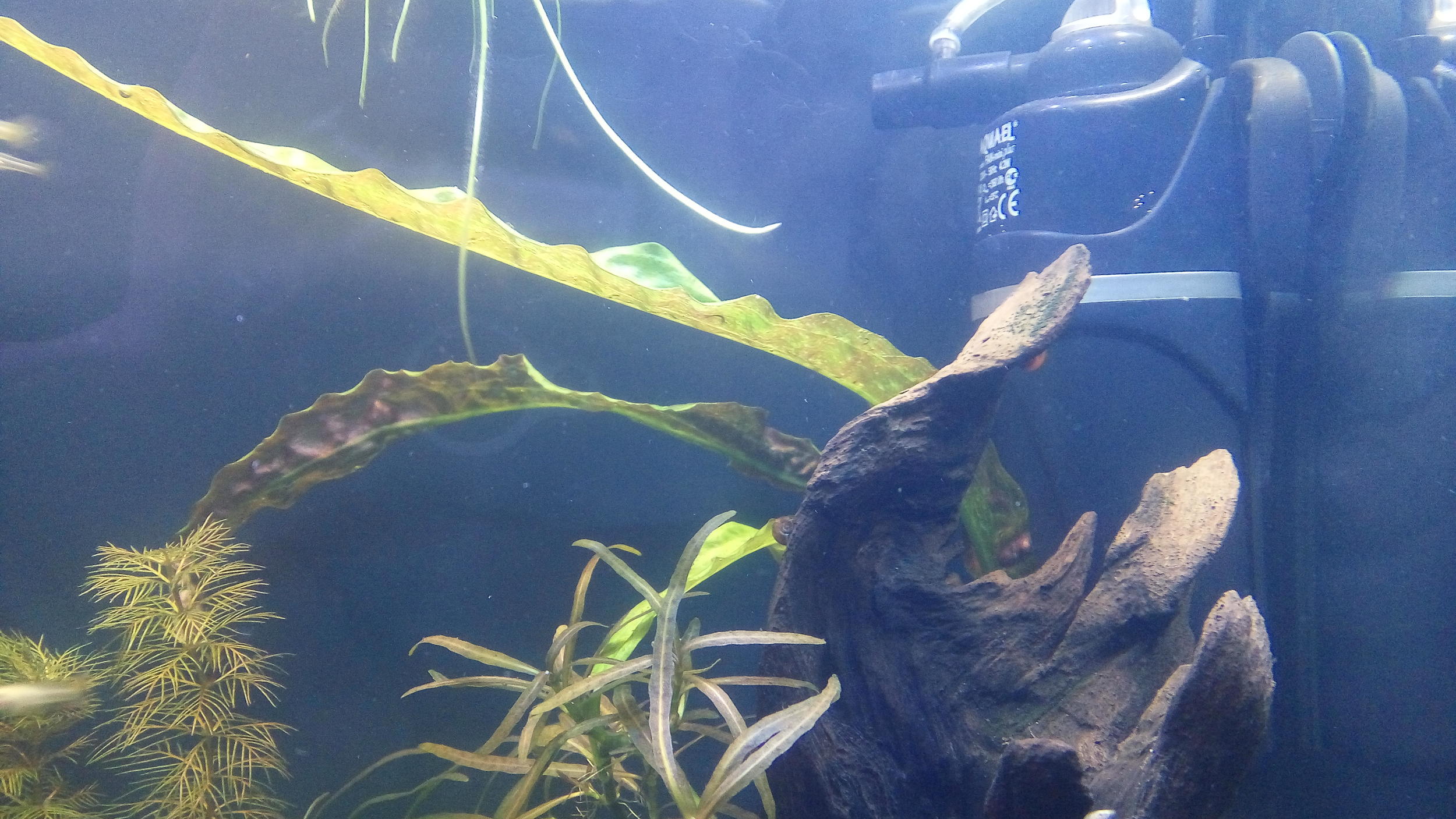 Освещение - 11 часов. Растения в аквасе какого то неестественного цвета.... Какие то бледные- бледные... Корягу выбросил из за постоянно скапливающейся органики под ней. При чистке ее, всегда присутствовал запах гальюна...В общем избавился...(хотя классная была коряжина!)