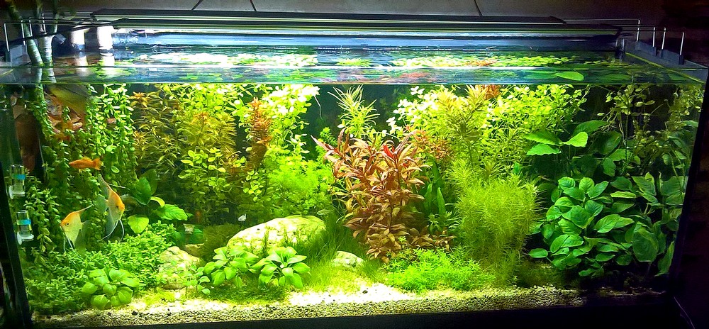 Пора, наверное, обновиться)) Как я понимаю, до конца апробации около полутора месяцев. После установки контроллера и выполнения раздельного по времени включения света (передний светильник с 12 до 22-х, на дне имеем 3000 лк, задний с 15 до 20, в паре на дне имеем слегка за 6000лк) аквариум преобразился.