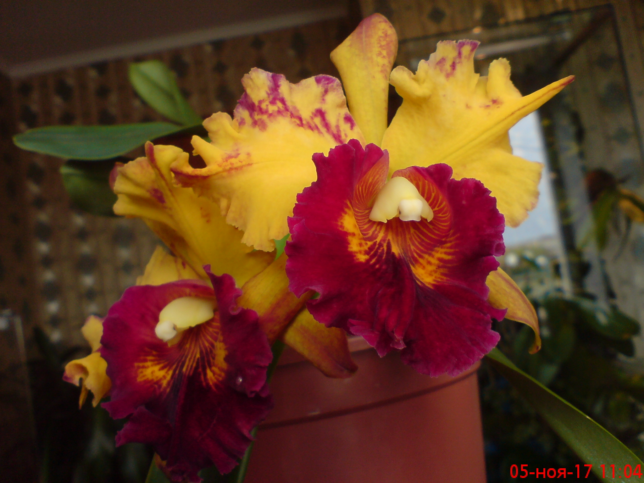 Расцвели мои две красные каттлеи и растят в это же время еще новые росты. на одной 4 цветка на другой 3. посаженные двумя бульбами два года назад второе цветение