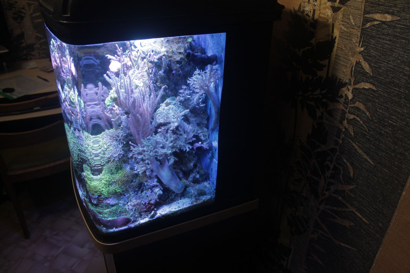 Запущен ровно год назад в конце сентября. Все полностью адаптировано и функцианирует идеаль, без колхоза. Свет леды с контроллером на блютусе с большим запасом мощности,с холодильником пр-ва италия.Имеется встроенный в крышку термостат с вентилятором.Косметика в отличном состоянии.Тумба пр-ва акватика с усиленной столешницей. Живность прекрасно себя чувствует и радует глаз.Аквариум чистейший,без мусора и детрита.Рыб не было,только беспозвоночные.