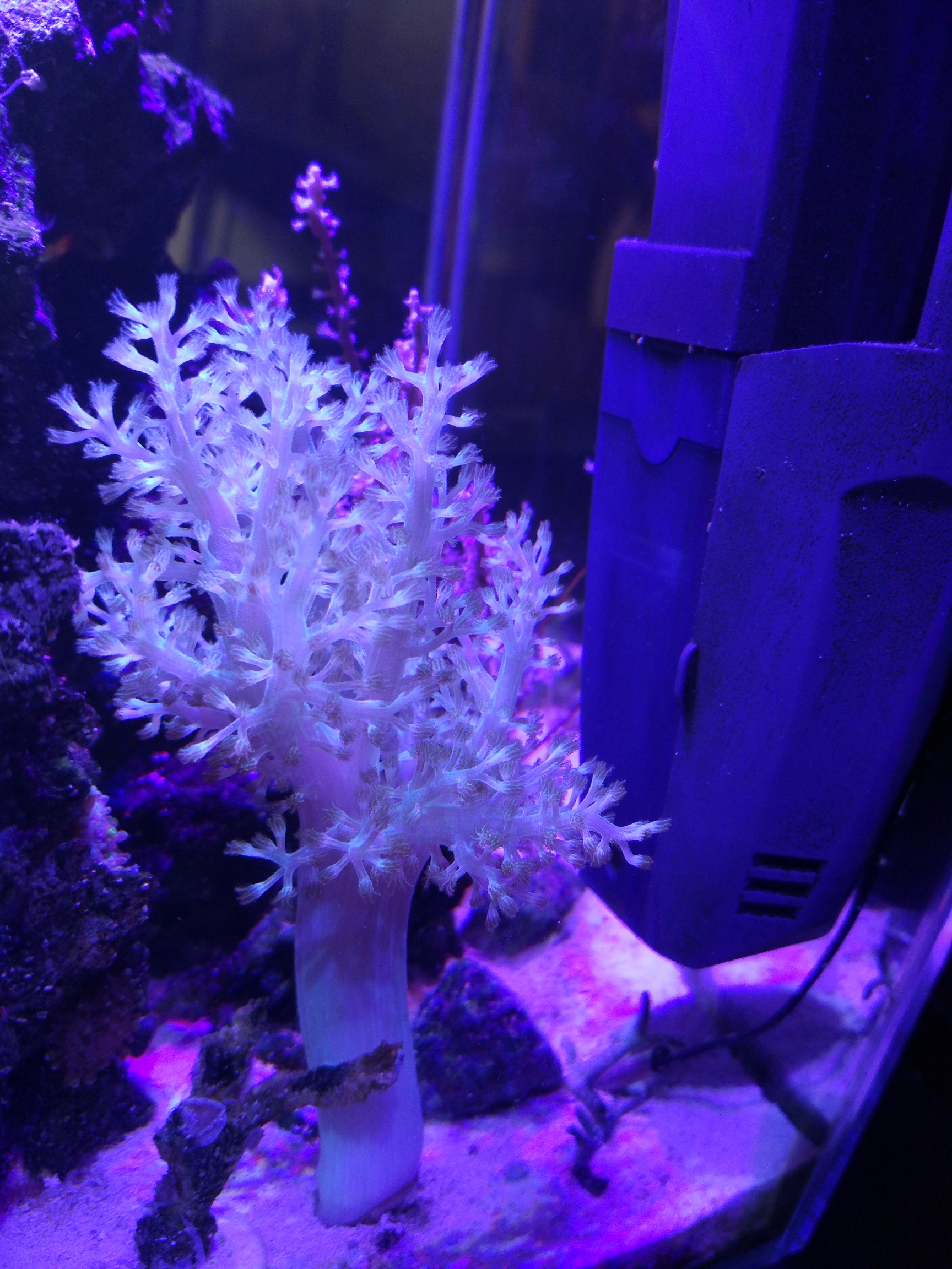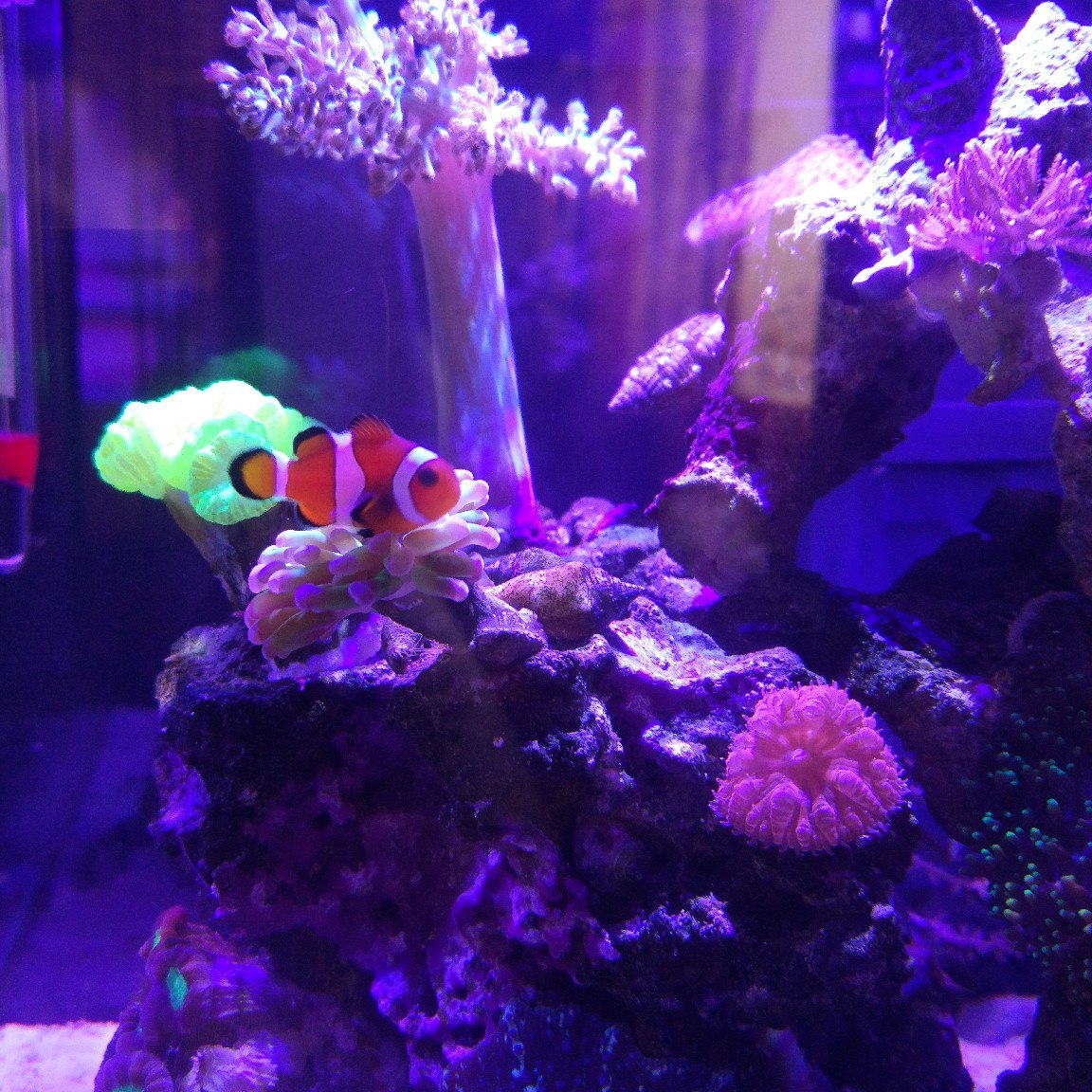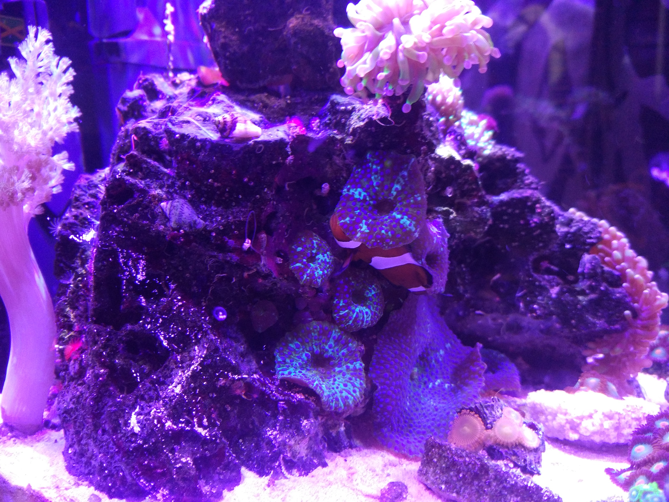 Всем привет,давно не писал,если кому интересно как поживает мой аквариум,то в принципе не плохо.))Летом я правда потерял Сериатопору,думаю из-за того что сильно испарялась вода и параметры воды скакали туда-сюда в течение дня,тяжело в таком объеме их контролировать, хотя изначально она росла быстрее всех кораллов,прям на глазах,но потом так же быстро начала белеть.((Хиднопора тоже стояла на половину облезлая полипы не выпускала,тупо была такая маленькая коряга и я решил ее уже списать и скинул на дно,так она валяясь на дне выпустил на полную свои полипы,которые еще остались,я был удивлен,странный коралл какой-то)ну и я решил его приклеить на плашку, стоит сейчас на дне с открытыми полипами,которые еще остались.С каулостреями тоже как-то не сложилось,2 вида отдал на восстановление Харьковскому моряку,а 3 вид деградирует у меня.(3 вида зонтов разрастаются,а 2 вида как было столько полипов,столько и осталось)Дискосомы это вообще сорняк,кучу деток наплодили.Клоун сидит - то в эуфилии,то в рикордеи или вообще в дискосомах заныкается и не шевелится)Вообщем скоро будет переезд в 66л,почти все готово для этого.