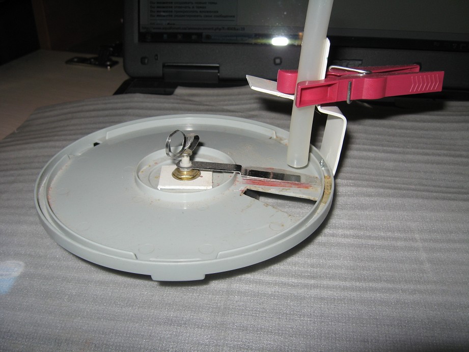 Состоит она с китайских настенных часов, нижней части от бокса для дисков, прищепки и кусочка трубочки, пластиковая бутылка. (Принцип данного изобретения встретил где-то на просторах нета). Настенные часы использовал по той причине, что у них большие стрелки, а у будильников маленькие (не удобно).