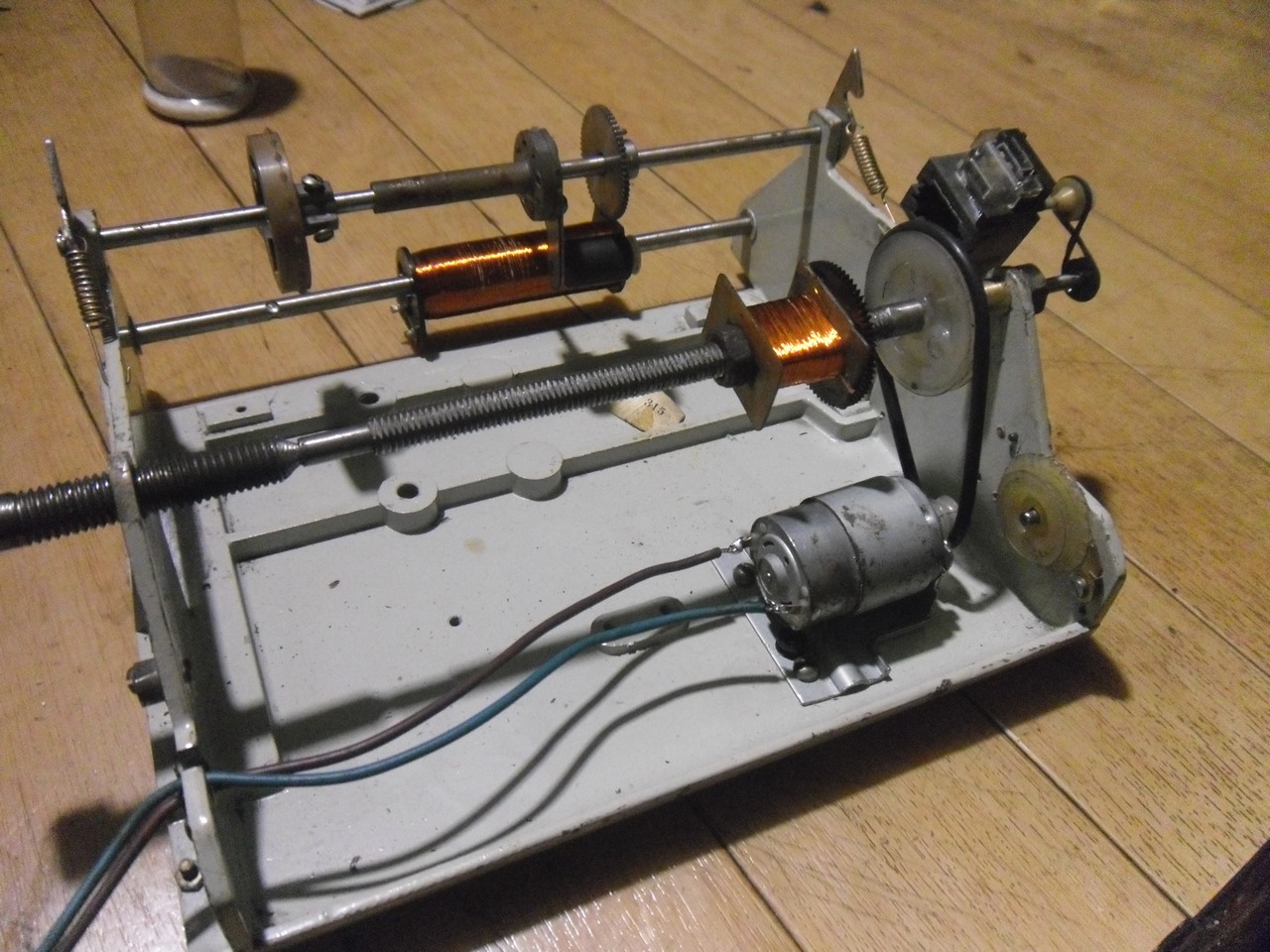 Пришлось на работе на скорую руку собрать намоточный станок из хлама.