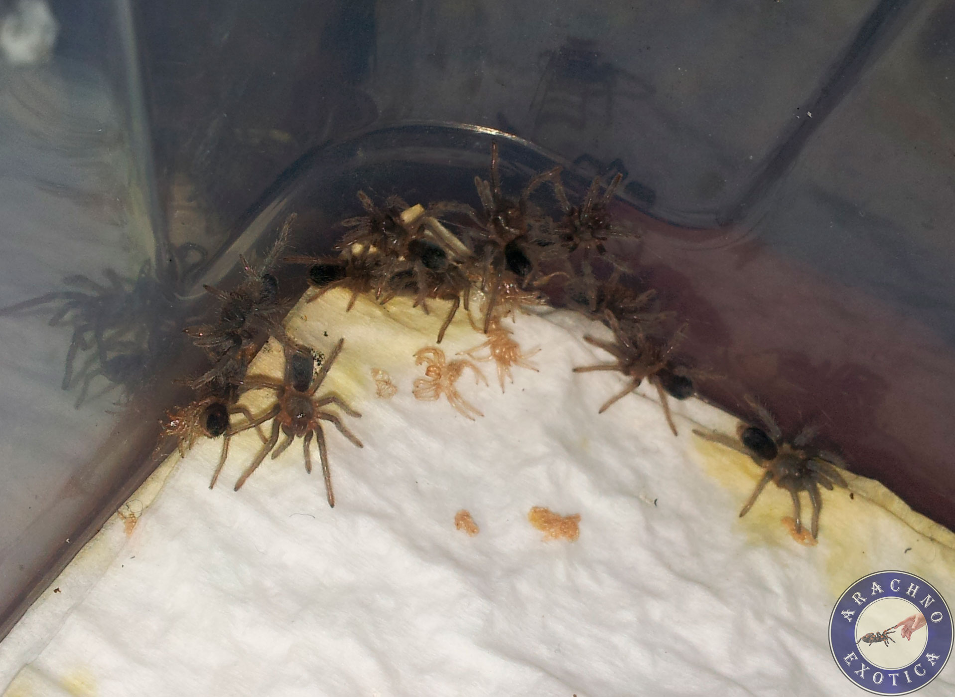 Спаривание в целом проходило без проблем, на последнем подсаживании самец был съеден. Статичный кокон, как ни странно, был сплетен не в укрытии, а на противоположной части бокса, где субстрат был всегда слегка влажный. Я считаю это важным фактором, так как довольно часто у "сухих" пауков коконы превращаются в "камень" из-за недостатка влаги при инкубации. На 21 день с момента кладки случился небольшой инцидент, а именно - бокс, где проживала мамаша с коконом упал примерно с двухметровой высоты. После этого события самка забралась к себе в нору и больше не подходила к кокону, поэтому было решено его забрать. При вскрытии обнаружены вполне бодрые нимфы 1 стадии. Не рассыпая их из кокона, помещены в инкубатор. Далее всё по накатанной, температура 27-29 градусов, влажность (по показаниям китайского прибора) 83-95%. Потери составили примерно 30 штук паучков 1 линьки и пара нимф 2 стадии, которые не смогли перелинять. По итогу 257 бодрых малышей уже рассажено. По вопросам приобретения пишите в личку, или смотрите в моей ветке продаж: http://www.aquaforum.ua/showthread.php?t=236012