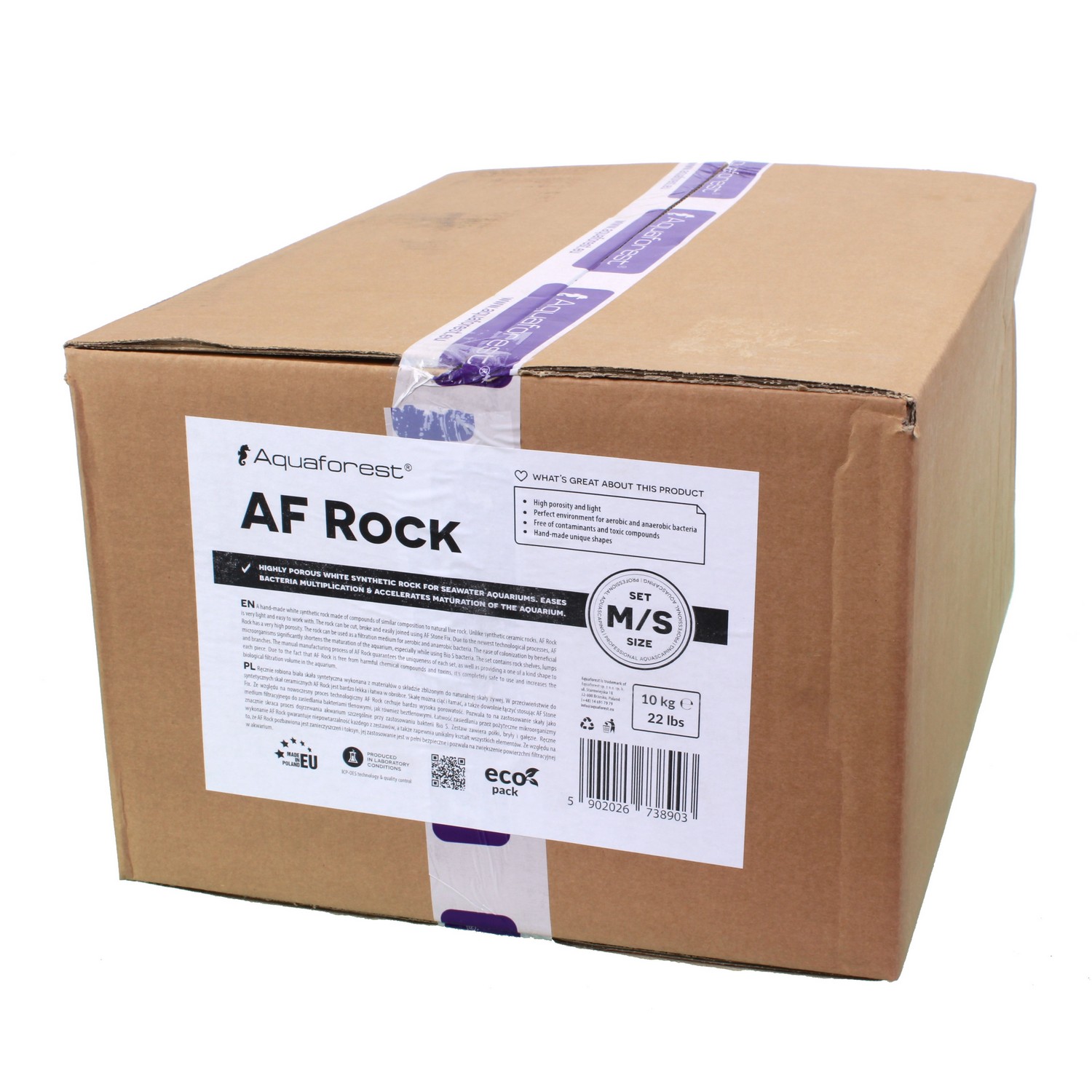 Синтетичний камінь Aquaforest Synthetic Rock M/S 10кг Box, виготовлений з матеріалів, схожих за складом з натуральним живим каменем. Це не кераміка і на відміну від неї дуже легка. Процес виробництва синтетичної породи забезпечує дуже високу пористість. Це дозволяє використовувати його в якості фільтруючого середовища для заселення аеробними бактеріями, а також анаеробними бактеріями. Володіє дуже високою здатністю розселятися корисними мікроорганізмами. Це дуже простий в обробці продукт (його легко розрізати і склеювати). Готові конструкції полегшують швидку збірку в морському акваріумі.