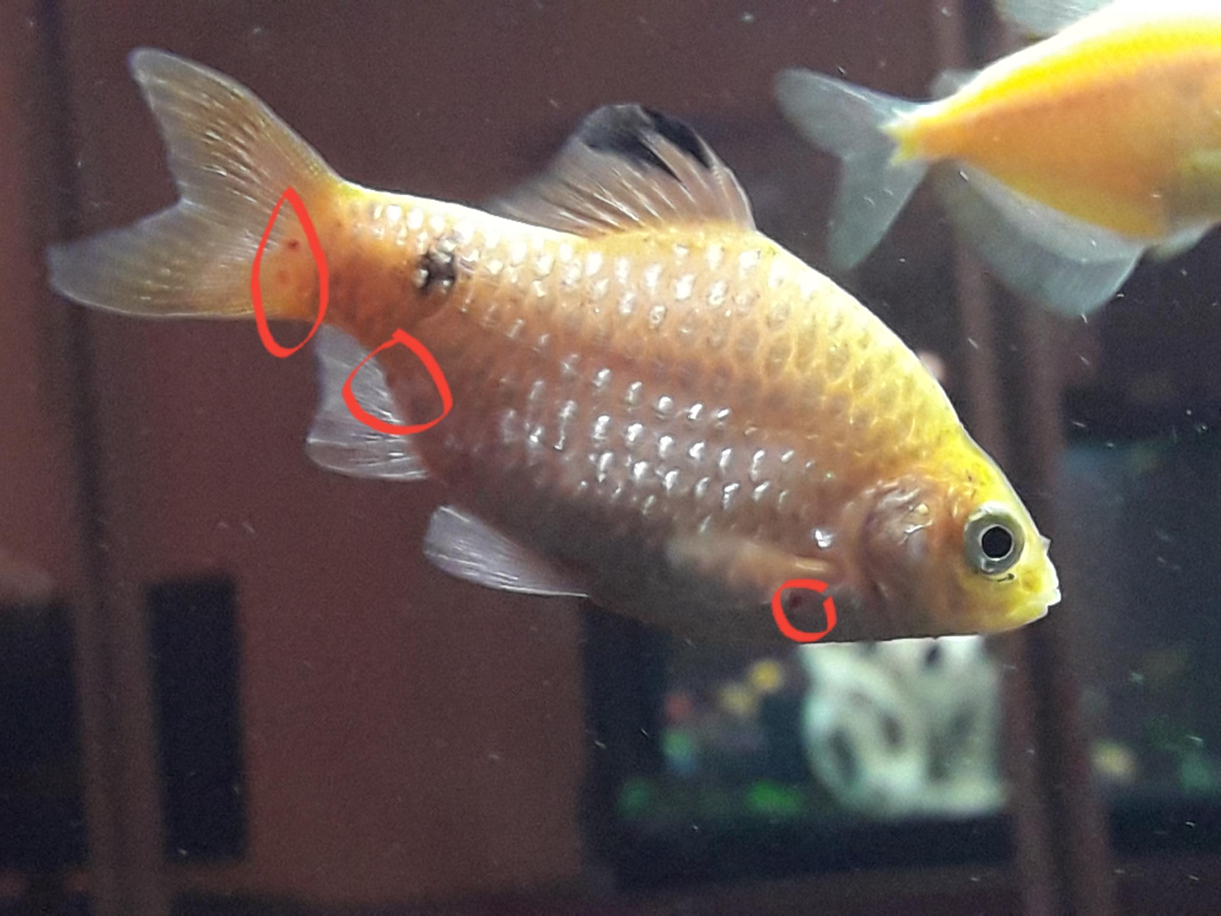 Попри всі лікування підхопив, швидче за все, плавникову гниль, якщо помиляюсь виправте, даю фотку тернеції. З барбусом знов біда знов рани на брюсі, але тепер і на хвості (на фото червоні цяточки).