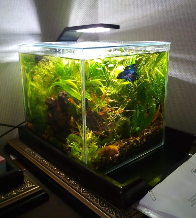 Взял у человека десяток креветулек и несколько пучков мха, чтоб им было где нычковаться, так как ранее не удержался и прикупил петушка из жалости, и теперь этот неугомонный непрерывно шастает по зарослям пытаясь охотиться.