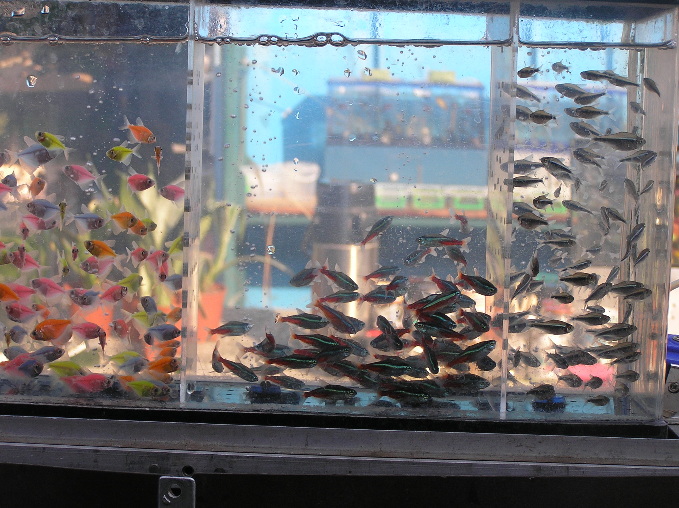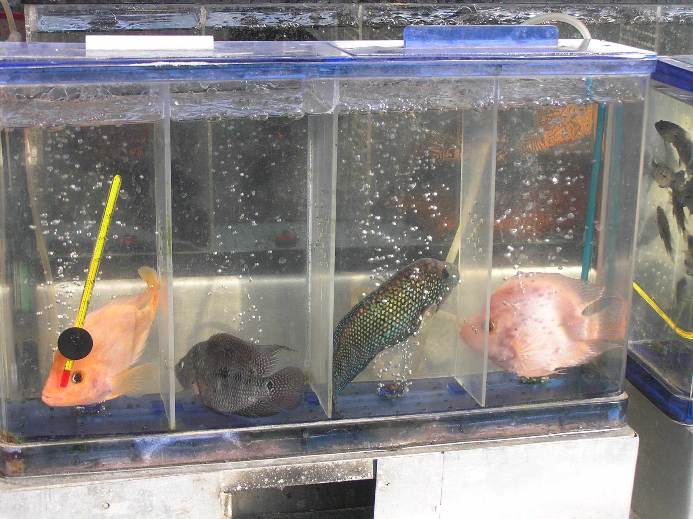 ...Но мой взгляд направляется дальше и в глубь рынка.И там вижу,что ,как и раньше стоят оквариумы,ширмы,а там тьма тьмущая рыбок.Пусть не так,как в былые годы,но все же нормально на первый взгляд.Делаю по рядам несколько проходов с виражами для поворотов.Как говорится,"иных уж нет,а кто далече".В то же время вижу,что кое- кто даже расширился,было по одной-две ширмы,а сейчс и поболее.