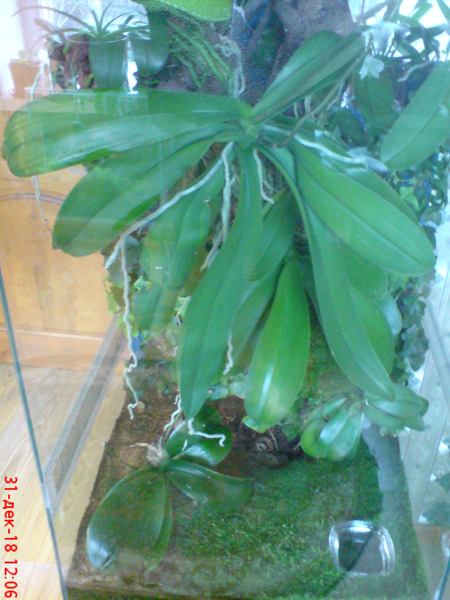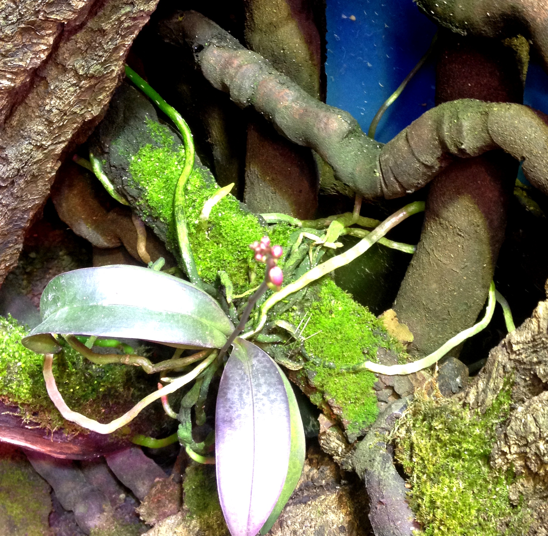 Phalaenopsis lindenii вообще не касается основанием чего либо,он весит в воздухе на корнях ,я свесил его на старых корнях -тряпках из горшка ,некоторые , где теплилась жизнь , даже дали боковые ответвления. Вот другой ракурс, где видно , что он висит . Я считаю разрушение основы крепления не критично для фаленопсиса , главное чтоб корни успели обвить окружение основательно, на данный момент нет даже намека на "окукливание" корней ,все кончики острые и быстро "расползаются" во все стороны ,заплетаясь петлями. Его уже сейчас изъять нереально.