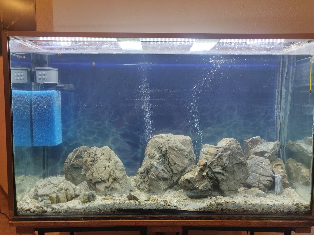 Добрый день. Принимайте в свои ряды. Первый большой аквас, достался в наследство, стоит в офисе. Грунт морская галька, голова с губкой VIA AQUA VA-475B. Компрессор Collar на 2 выхода. Карпатский камень от gigantic_bream. На сегодня там живут пара гириков и анцик. Планирую запустить малавийцев: