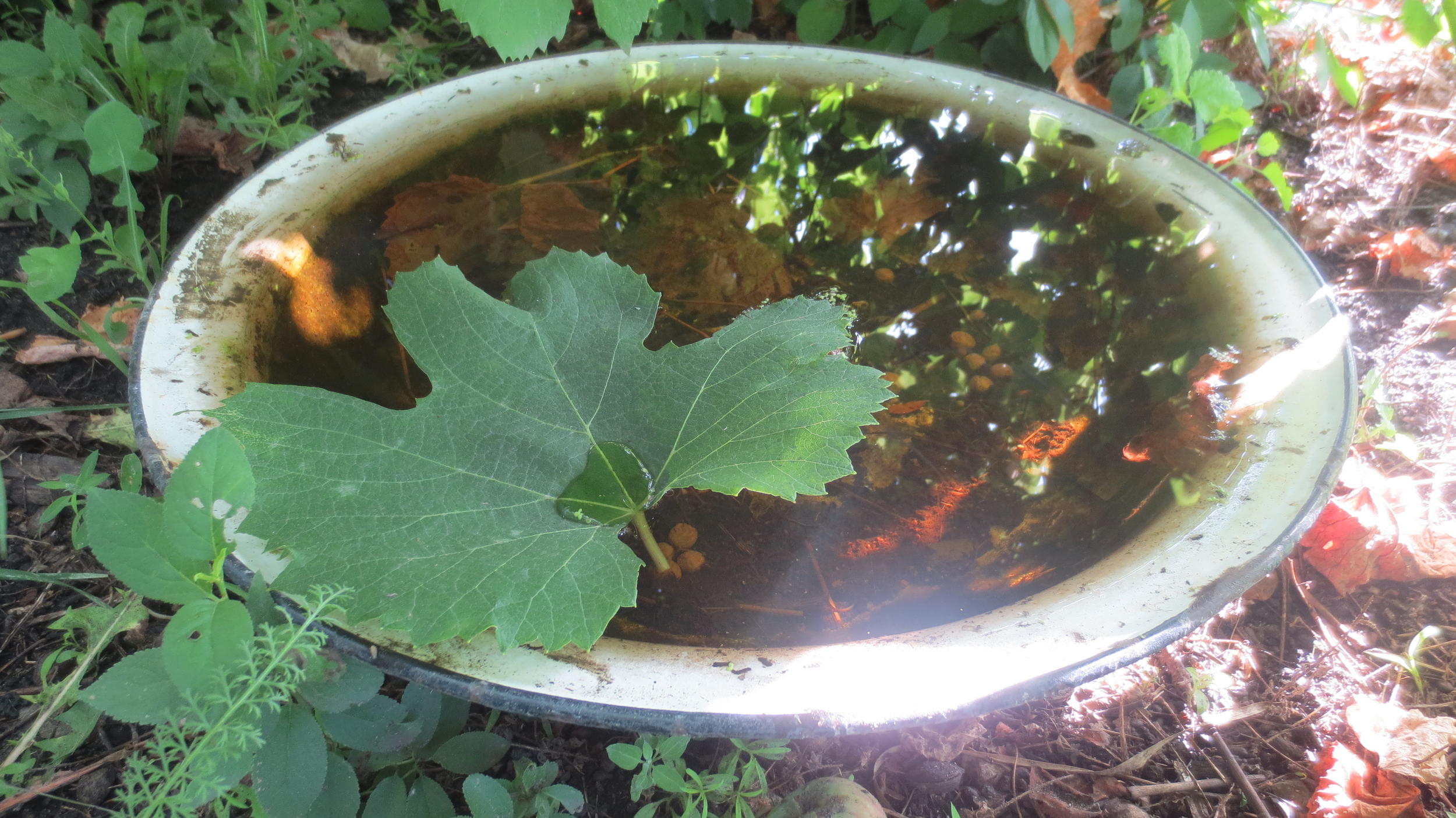 Поставил старый бак под сливу, налил воды, бросил несколько листьев сливы, налил пару литров воды принесённых из природного водоёма.
