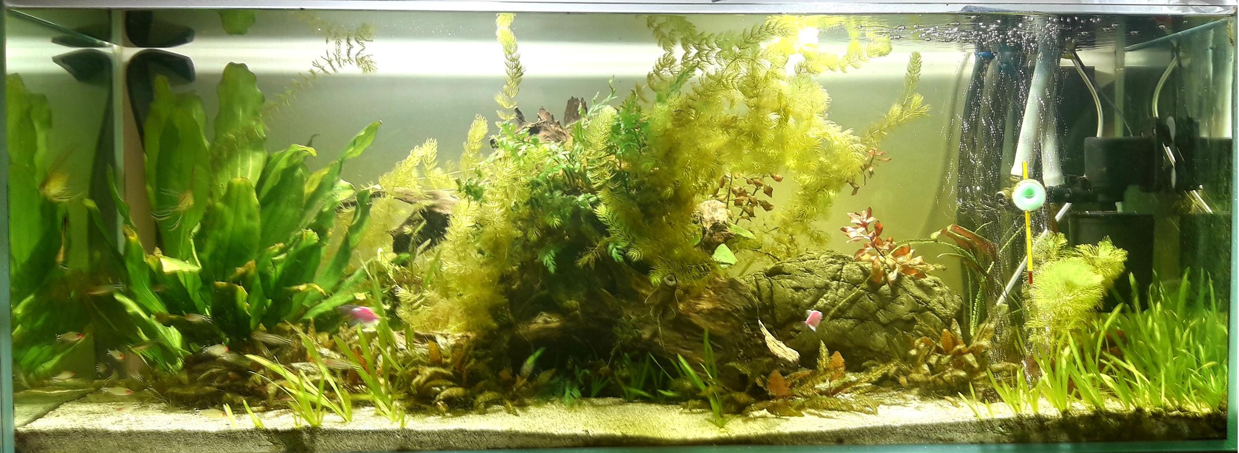 Я аквариумист начинающий, и после запуска 45л банки столкнулся с проблемой света в заводской крышке, там был всего 1 моленький патрон... Не долго думая поставил себе 2 прожектора по 10w 6500к 800lm каждый. Да, свет преобразился, игра света в комнате от волнения воды и т.д. как в первом посте... При фото мерехтение есть но так как под крышкой на глаза не ощутимо. Столб воды примерно 20см , и так как банка новая плюс я не опытный присудствует и бурая и олений и нитчатка мох окупировала. Я не унываю не трагедия, жду баланс в общем не в этом суть.