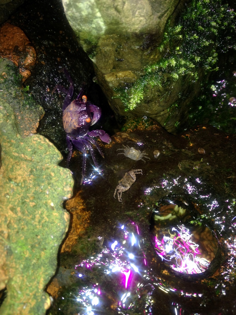 Недавно взрослый краб меня напугал.Обычно клянчит еду раз в 2-3 дня.А тут долгое время не просит,я его не вижу,потом появился,нервный,еду не берет,что-то лапки сильно яркие,прям красные как мясо.Думаю,заболел и скоро конец ему((Через пару дней стала искать его.В судочке,где земля лежит краб вверх ногами,уже без мяса.Я расстроилась,думаю,может мушки съели,оставили хитин только.Стала разбирать водопад,убирать судок с землей...и тут на меня 2 глаза красных уставились))
