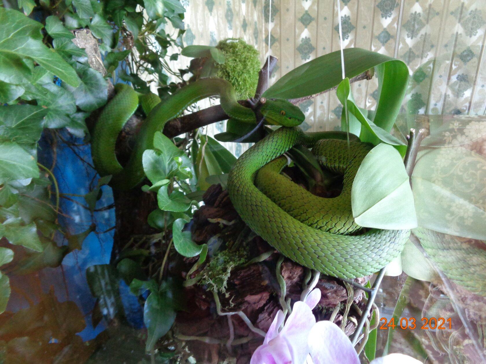 влажность поддерживается за счет опрыскивания дистиллированной водой дважды в день в 12 и 21 час. в 12 часов опрыскиваю и змей вечером только террариум. влажность находится на уровне 75-90%.