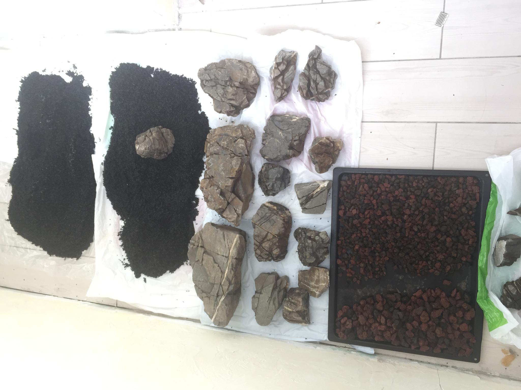 Сейчас про то что будет внутри. Купил питательный грунт от Акваера 3кг, мелкий базальт - 12кг и лаву 3 кг, два их которых уйдут во внешники. Так же взял 29кг карпатского камня. На вид очень даже классно смотрится. Смущают прожилки белые, но продавец уверяет, что не фонит. Посмотрим :-)