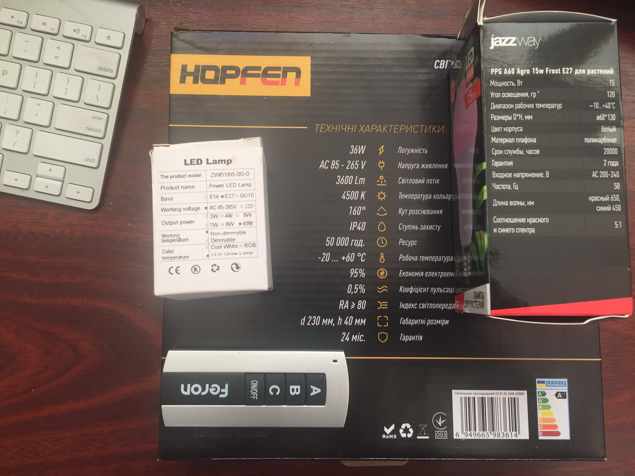 Про свет. Поставил одну нейтральную лампу на 36вт и 4 фитолампы: 2х24 и 2х15. Вывел на дистанционку, включаются как все вместе, так и в любой комбинации.