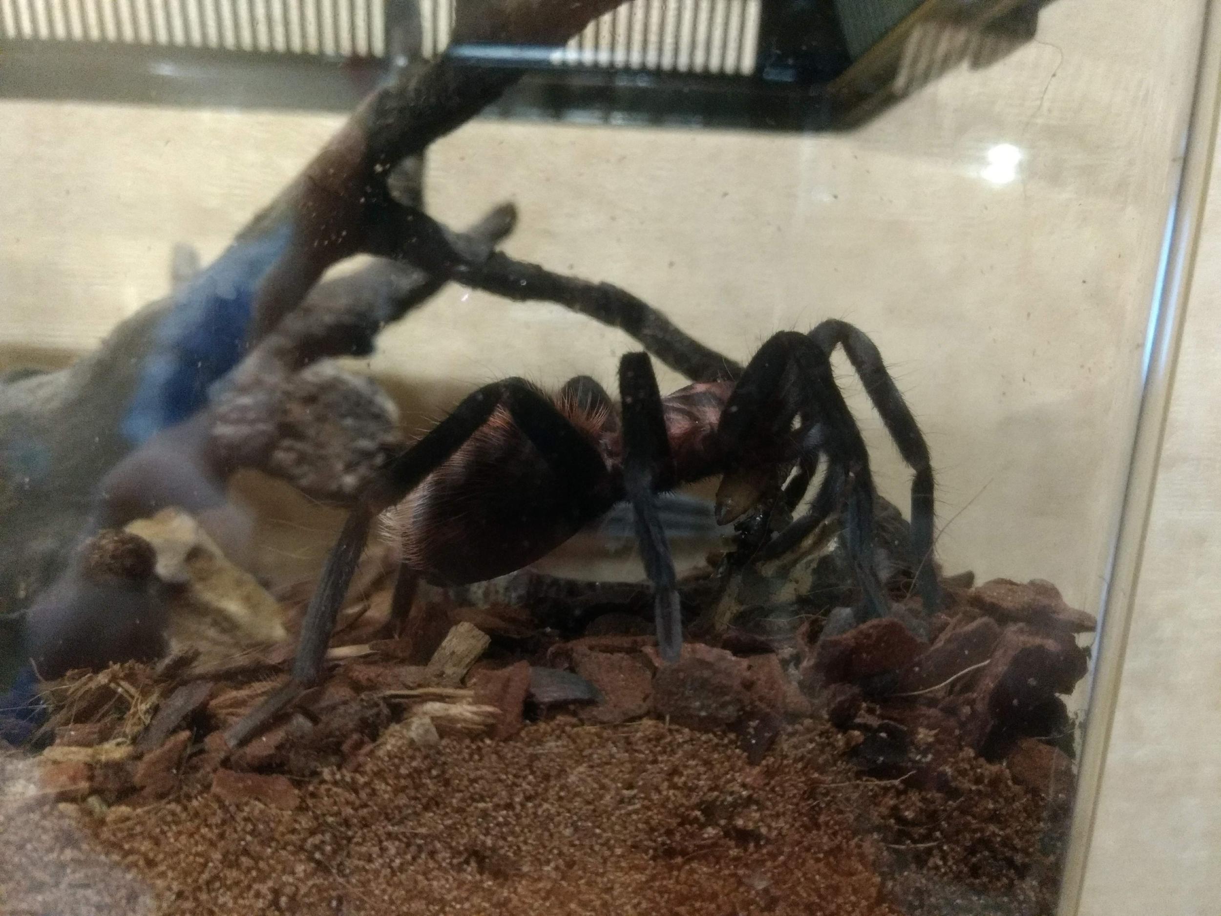 Xenesthis Immanis FM в новом доме и сразу за обед 🕷️😁, аппетит у них отменный, заселяешь в новый террариум кидаешь корм сразу набрасываются. Отличный паук даже для начинающих, дорогой правда.