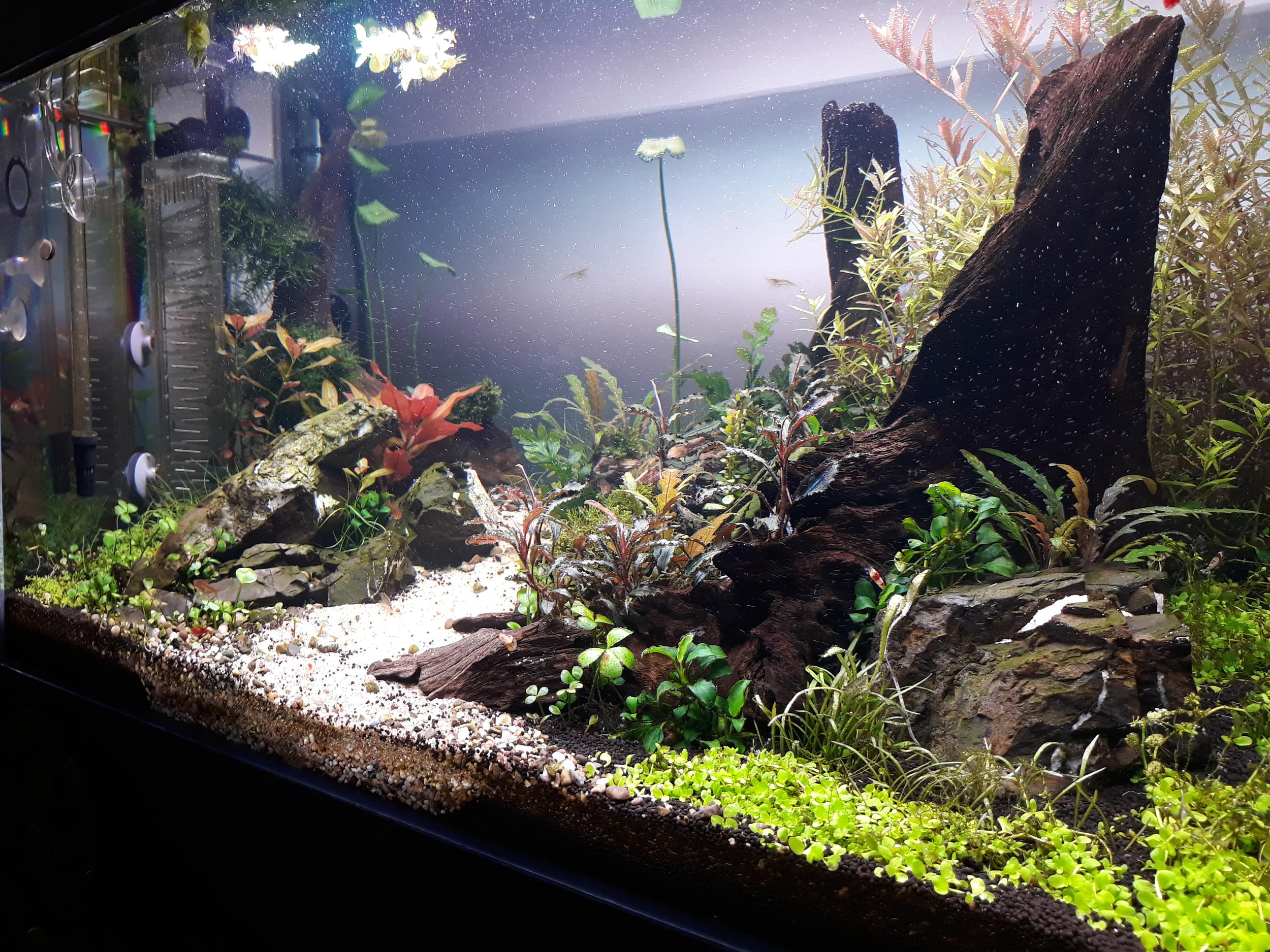 Порекомендовали Тетра Аманду, заселил 15 рыбок, симпатичная рыбка, но пугливая, пока прячется по углам.