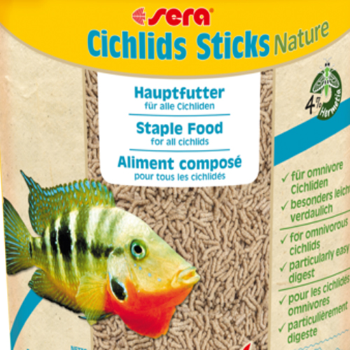 Sera палочки для цихлид Nature – основной корм без красителей и консервантов, состоящий из мягко изготовленных палочек для крупных всеядных цихлид, таких как многие южноамериканские виды, и других крупных рыб.