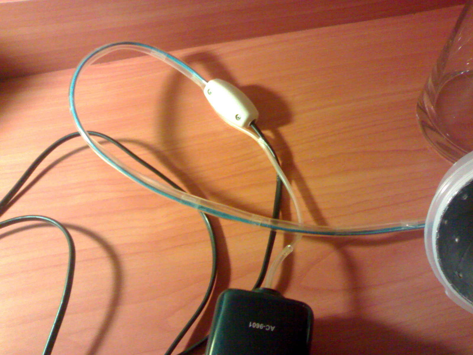 Были соединены все провода, подключена вилка, электропровод всунут в кембрик (использована трубка для аэрации), подключен выключатель, компрессор Resun, трубка аэрации и питания смотаны с друг с другом при помощи обычного скотча.