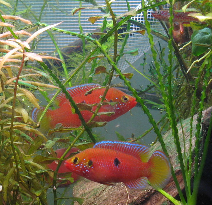 Пока только один из экземпляров принял окрас наиболее приближенный к взрослому, два остальных сероватые, правда с голубыми крапинками наголове. Заметил, что рыба "средней воды". На дно опускаются, чтобы пошариться среди камушков, к поверхности всплыыают во время кормежки.