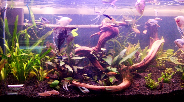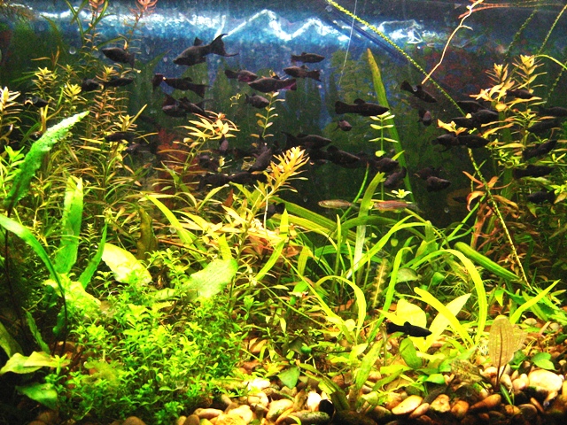 Вчера решил навести порядок в банке 230 л. Были удалены растения, рыба не удалялась из аквариума, далее промыл грунт и засыпал поверх  богатого детритом первоначального грунта, базальт фракции 3-5 мм. Наутро вода была, как слеза  Обошлось без жертв. Сегодня, засадил баночку отбросами производства  По правую руку, где нагреватель, высажена молодь спиральной валлиснерии, которая прикроет нагреватель, довольно быстро, а её тень не будет наводить дискомфорт соседнему криптокориннику, по центру анубиасы, за ними красная нимфея и рдест гайя, которая прикроет флейту фильтра. По левую руку небольшой садик эхинодорусов, закрывающих фильтр. Из-за избытка света фото получились не ахти, но по ходу пьесы буду выкладывать.
