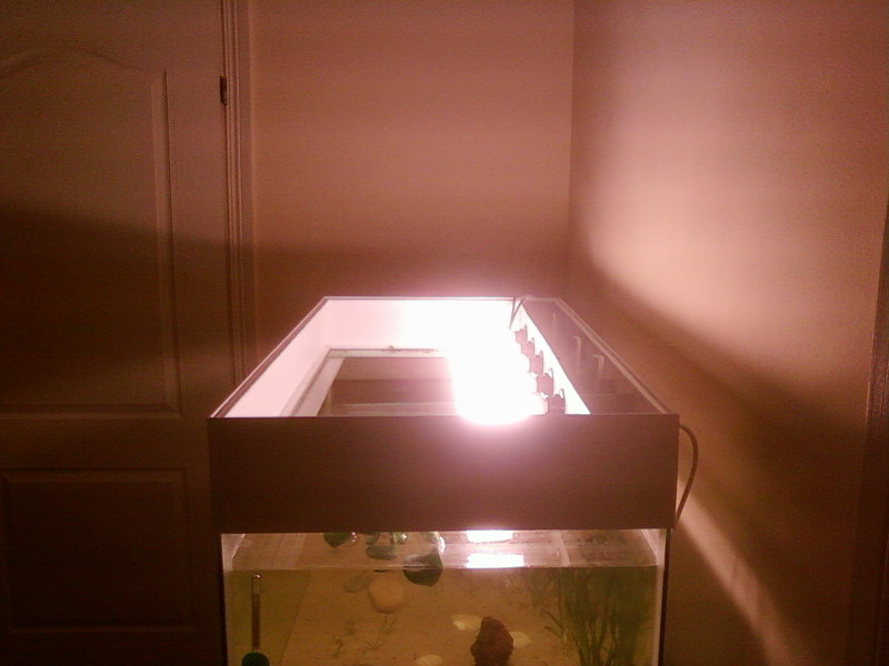 Я рекомендую поставить хотя бы парочку "дорогих" энергосберегалок(например фирмы osram), так-как они имеют более широкий спектр свечения люминофора.На первой фотке хорошо видна желтая составляющая спектра,на второй фотке ее нет совсем.У самых дешевых энергосберегалок,спектр очень бедный,что может негативно сказаться на росте водных растений.