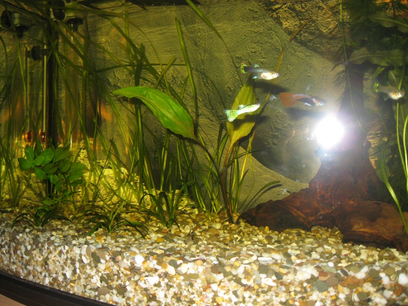 Итак, мне кажется что аквариум запустился нормально. Растения ростут, рыбы беременеют. На сегодняшний день в аквариуме обитает две пары гупышек ( дамы как мне кажется немного беременные  )и три крапчатых сомика ( если я правильно поняла что пол у них можно определить по спинному плавнику ( у самцов он острый, а у самок закругленный), то у меня два мальчика и одна девочка. Все чувствуют себя отлично ( мне так кажется). Через неделю надеюсь появятся штук 10 креветок черри. А еще через недельку подумаю о новых жильцах. Еще правда не решила кого именно приобрету, но склоняюсь к меченосцам.