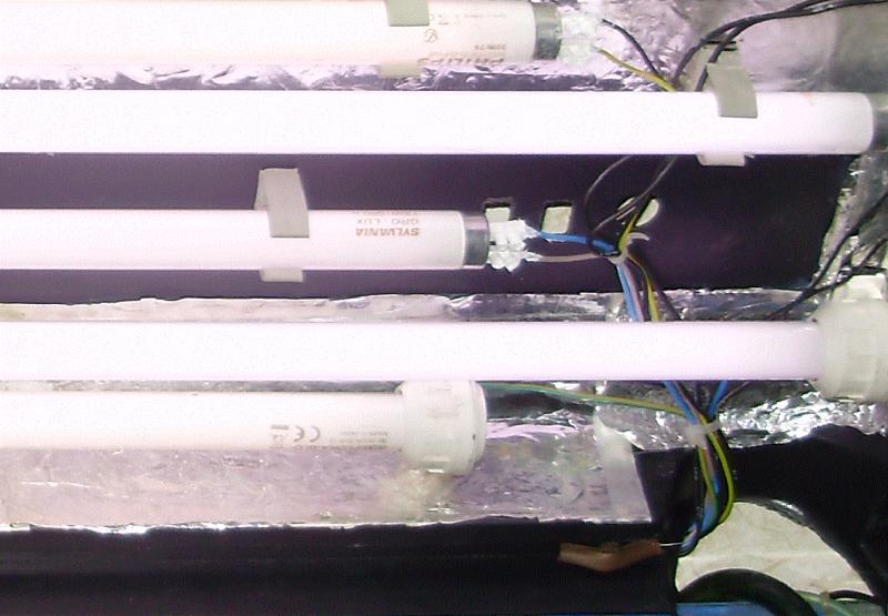 Полная переделка крышки.В первую очередь был удалён короб,на его место стало две дополнительных лампы.Для крепления ламп были применины держатели металлопластиковых труб,в место влагозащищённых патронов использовал скрутки для проводов. ЭПРА были вынесены на тыльный край снружи крышки и помещены в кабель канал и туда же помещены выключатели. В местах где возможно КЗ всё обработано силиконом.Ну и вот что получилось.
