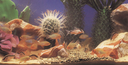 Дно было сделано в виде холмов. В разных масштабах из черного камня были сделаны надгробья (обросшие слегка мхом). Беспорядочно высажены невысокие кустики и вся композиция была выполнена с учетом перспективы. Синий свет ... и черные молинезии. Впечатление - АбАлдеть!!! Но дома такой аквариум иметь ... тьфу, тьфу, тьфу