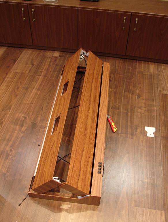 Механика собрана, осталось пару проводов заправить и распаять ввод. Из неприятного - пленка в эпицентре гавно. Китайская плохо липнет, немецкая жесткая и на заворотах отклеивается. Рекламщики так накатали - я бы может и лучше сделал. Два дня выгонял пузыри под пленкой. С клеем что то надо думать - цианакриловый слабо держит, легко отламывается, не эластичный, Акрилфикс 116 - не берет политирол практически. Конструкция основы получилась несколько хлипкая - переносить надо бережно. может вклею в углы усилители. Не совсем точно вклеились петли в базу - в результате крышка плотно не закрывается, остается зазор в 2-3мм, но тут я дремелем выготовлю посадочное место, просядет.