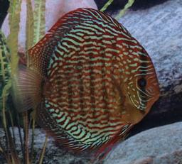 это мой вольный перевод Red Scribble. Они похожи на красных тюркисов, но цвета более темные и насыщенные. Спинной и анальный плавники с более выраженной темной полосой. На коричнево-красных полосах ярко красные точки (они вроде бы как и есть основное отличие от тюркисов). Если специально кормить (к примеру, с астаксантиновыми добавками), то точки заполняют практически полностью все коричневые полосы.