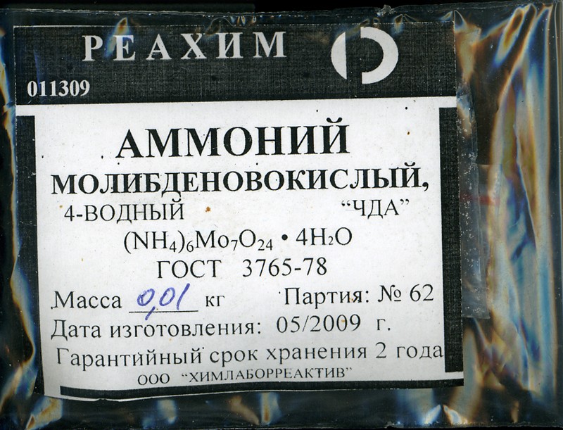 Ребята, только что заметил что мне продали аммоний молибденовокислый четырехводный с формулой (NH4)6Mo7O24*4H2O, вместо (NH4)3MoO4.