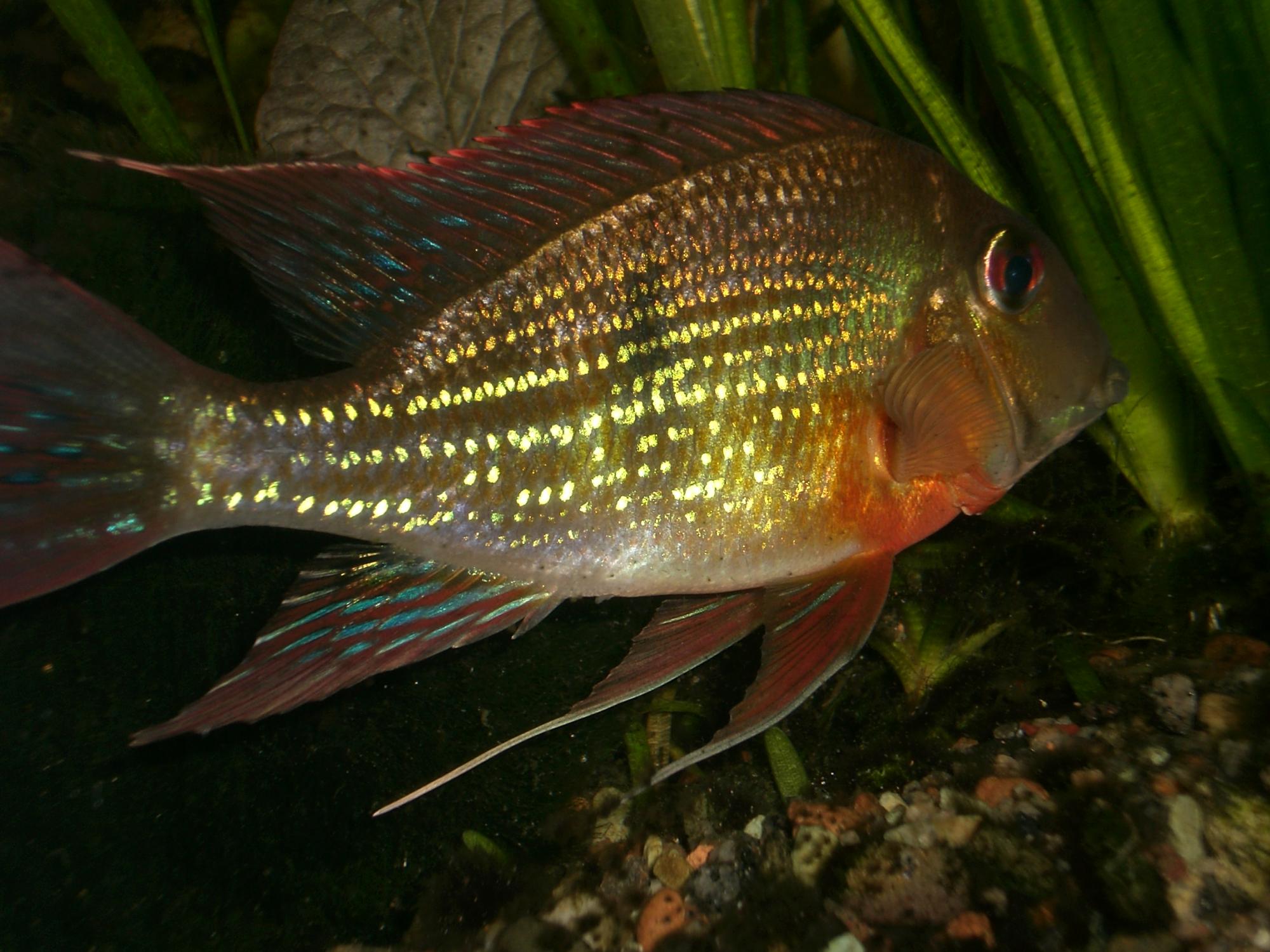 Добрый день! Вот приобрел таких зверей знаю что геофагусы а вид увы?Сейчас им около 7 месяцев размер около 12 сантиметров на днях должен быть первый нерест ,рыбка очень мирная и спокойная ,самка почти не отличается от самца разве что длиной хвостовых косиц ,на жаберных крышках внизу черная полоса ,горло грудные плавники и и место за жаберными крышками интенсивно красного цвета ,в окрасе больше желтоватого глянца ,рыбка просто супер.Может быть подскажете как называется? Заранее благодарен.