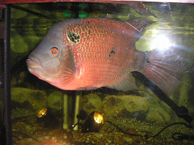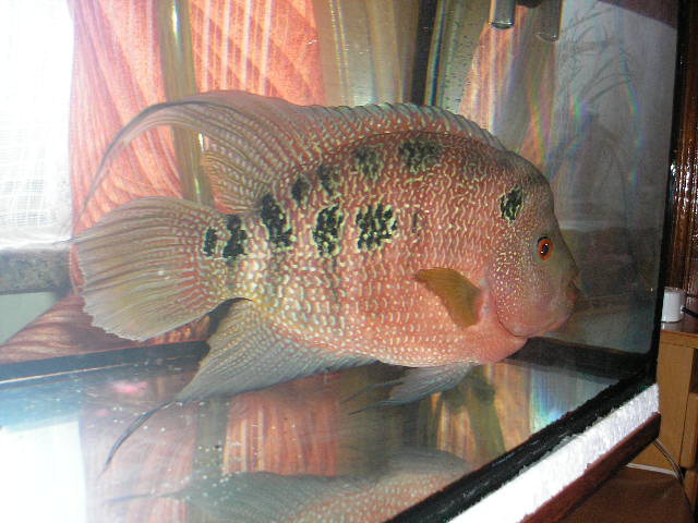 "Фловер Хорн Дисковидной формы (Дисковый). В отличии от обычной формы менее агрессивный (можно содержать с любой цыхлидой соответствующего размера и поведения - малави, попугаи, сомы...). Эта форма не требовательна к большим объемам аквариумов."