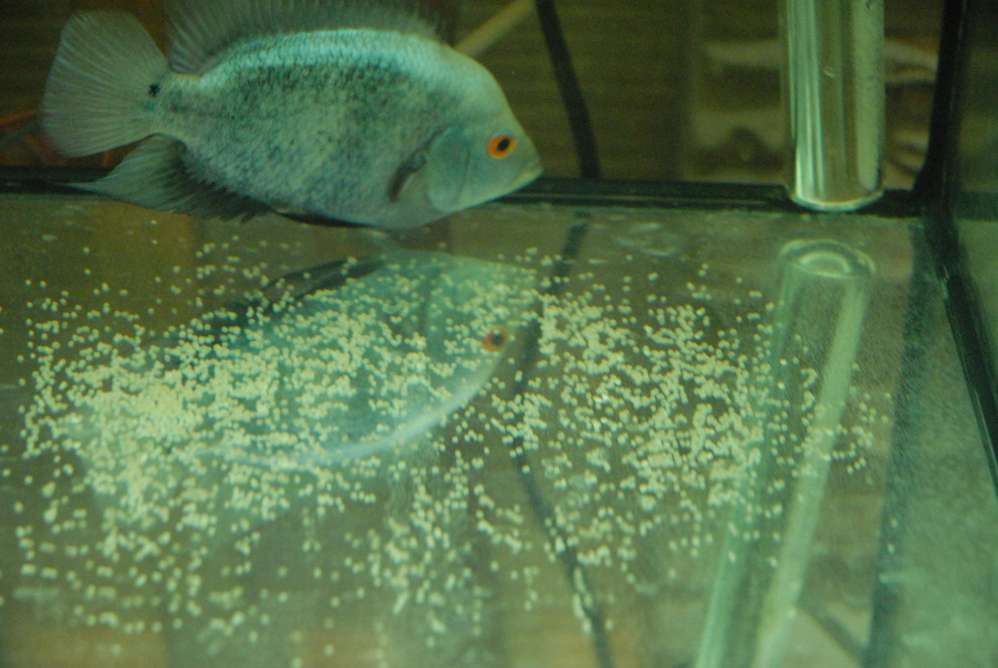 Наконец то с 3-й попытки удачно отнерестились молодые.Первый раз-икра не оплодотворилась,второй раз-сожрали  ,но потом видать настроились и выдали на гора  .Вот икорка.