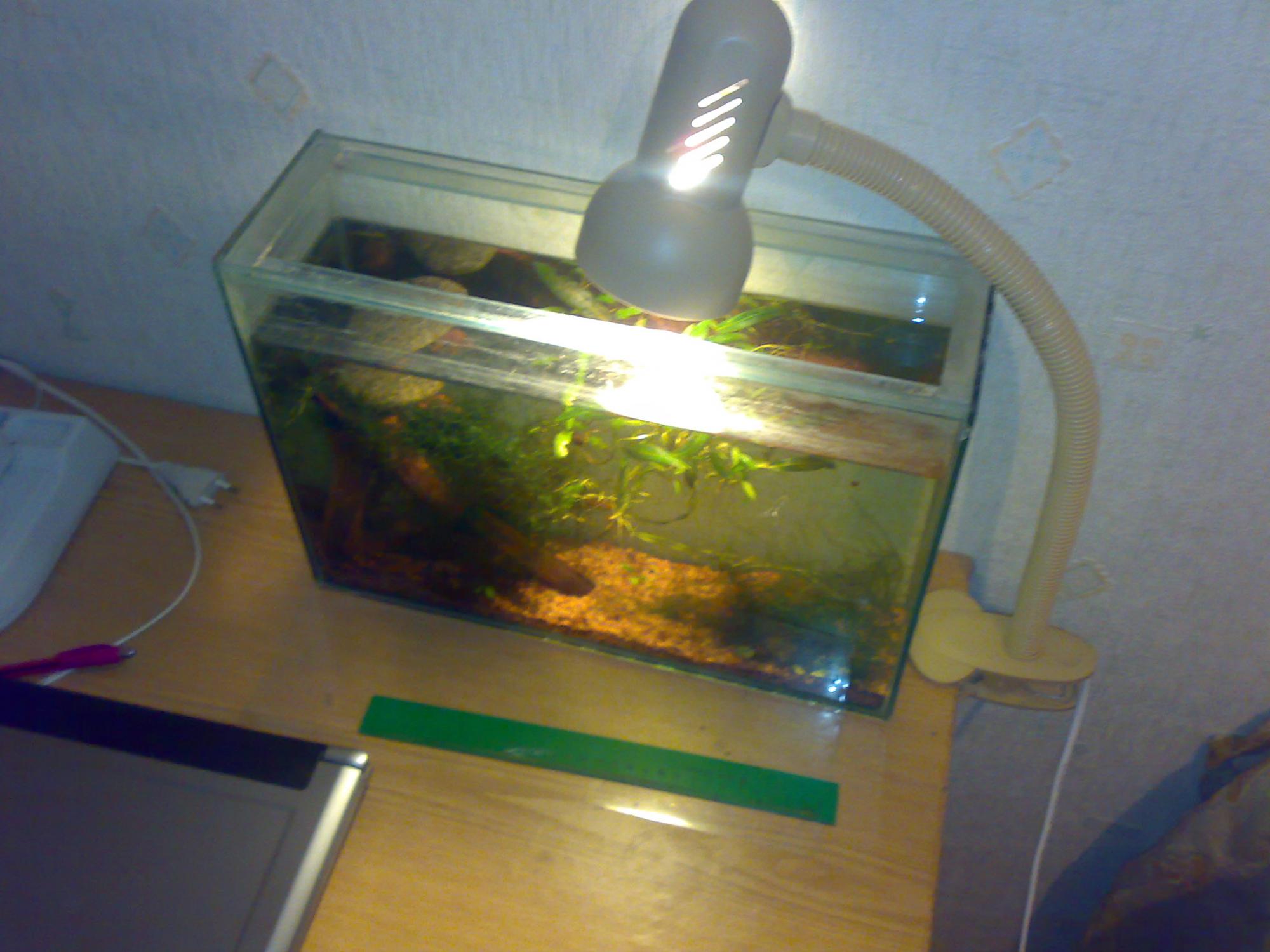 У меня в 30 л светильник на покровном стекле лежит Светильник - за 15 грн купленный в Караване судок для запеканок или чего-то там, из серебристого металла. В боках сделал отверстия по патрону с каждой стороны и туда сберегалки. Оклеил снаружи типа под дерево. Дешева и сердита и не совсем уродливо  (кстати, поставил 2 по 13 вт., т.к. от 15ти полезли водоросли)