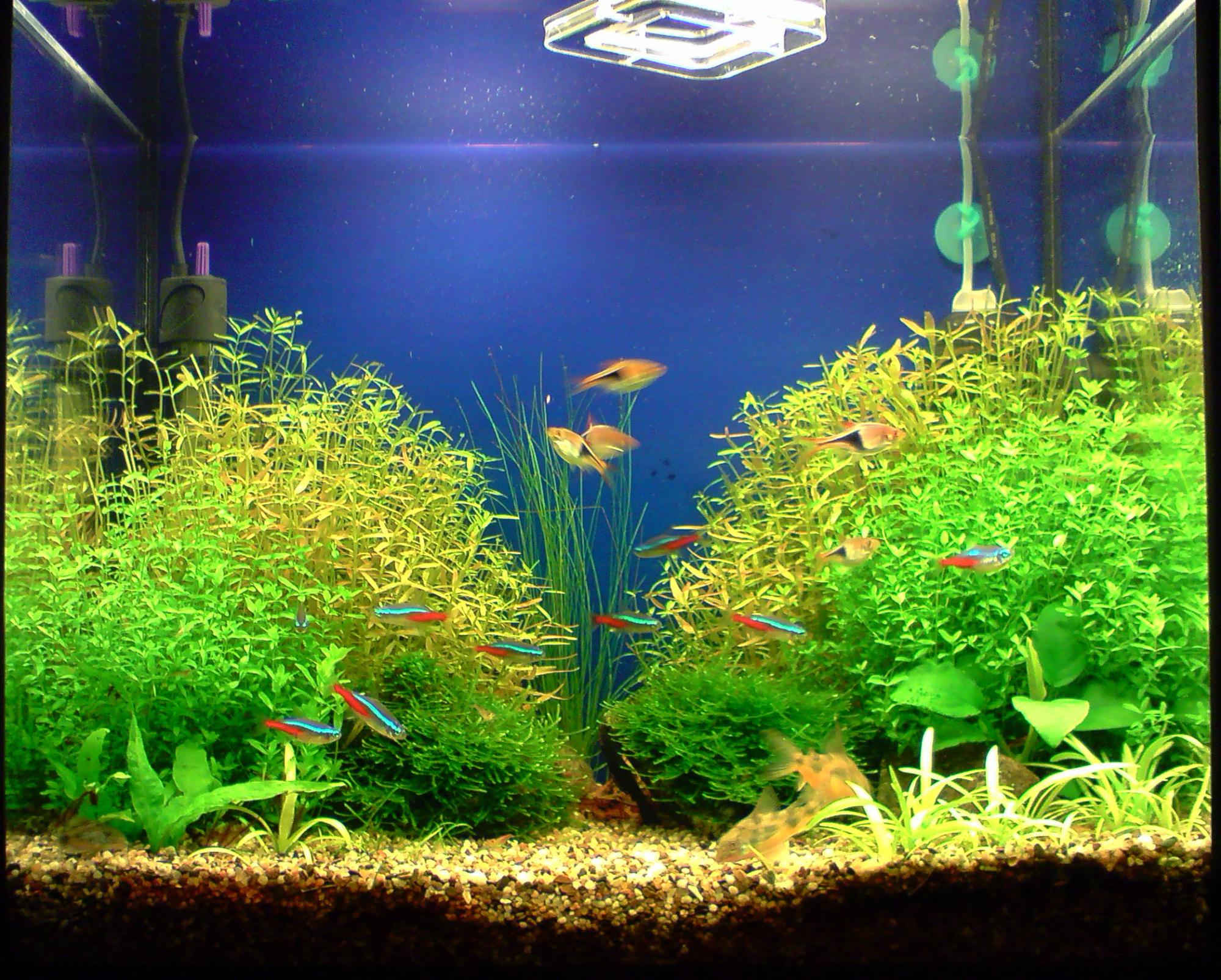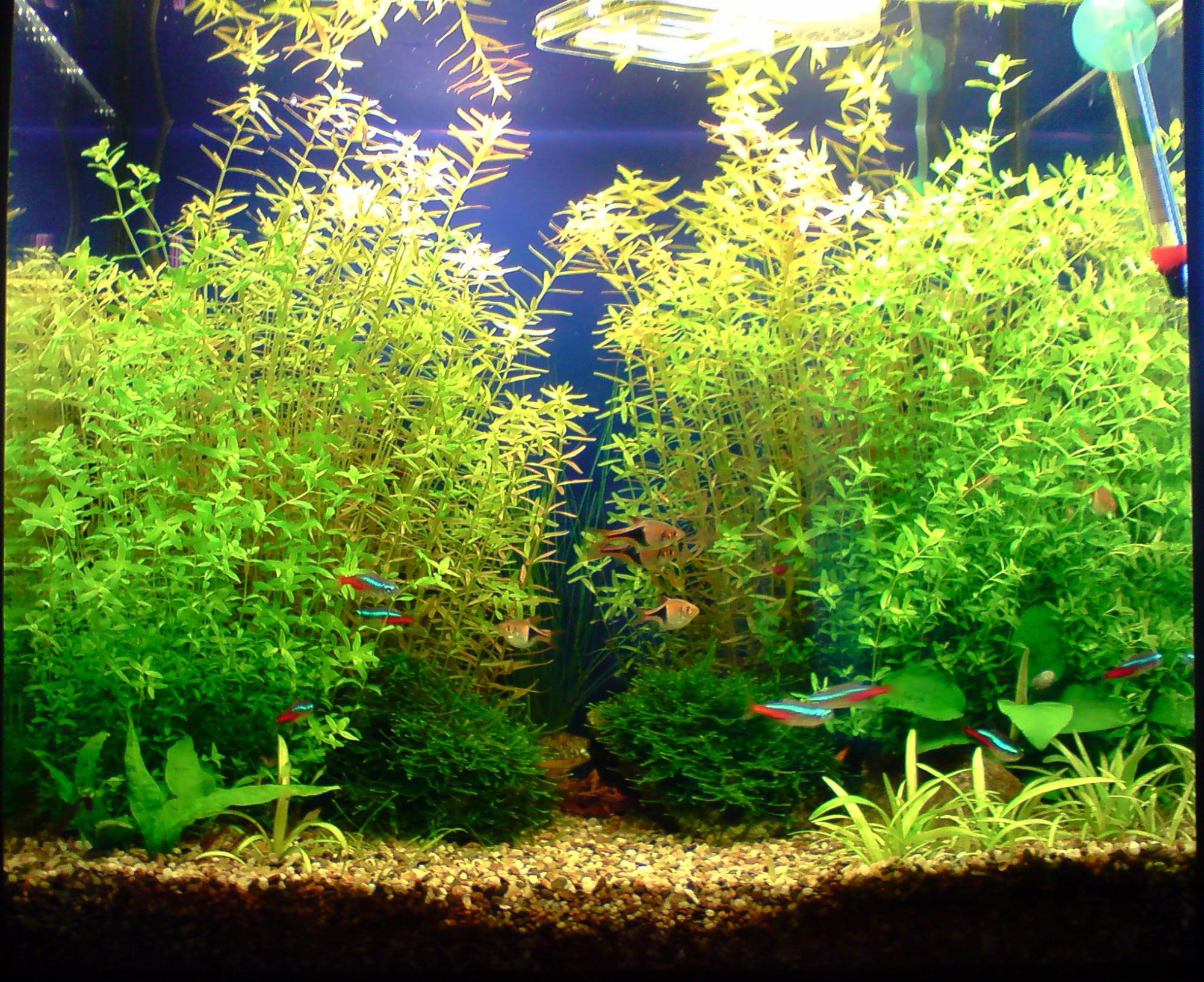 Подаю СО2 и начал лить удобрения - в результате ротала и, особенно хемиантус прут как ненормальные....на фото видно, что хемиантус дотянулся до поверхности. По плотности посадки почти достиг желаемого - и ротала и хемиантус растут очень плотно - редкая рыба продерется через заросли