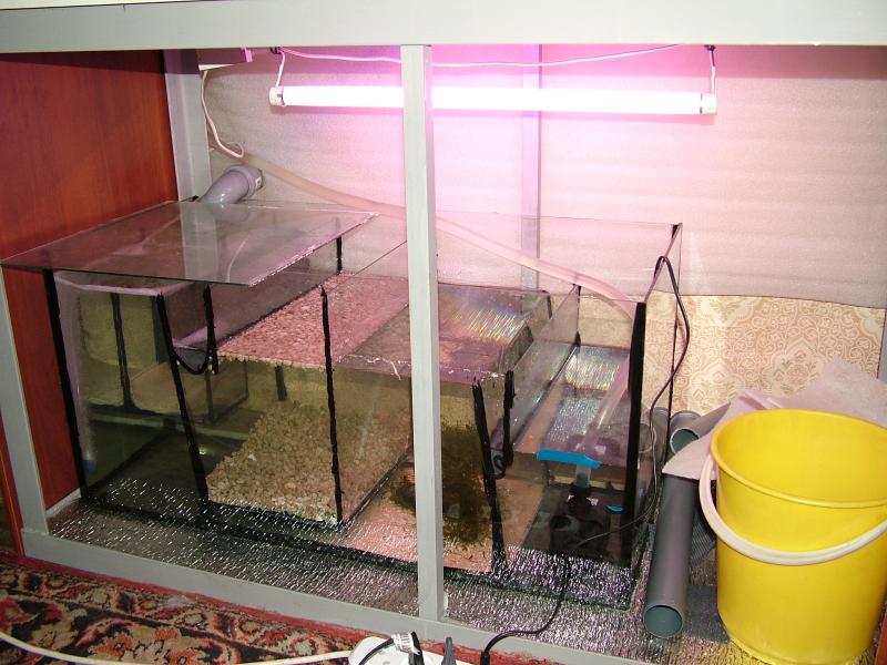 вот как то так, аквас 1200х60(высота)х50(глубина) лампы 2-лб (были с арматурой потом поменяю) 1-синяя китай 1-розовая китай, слив труба 50, течение synsyn на 3000, возвратная халеа 6520. наверно света в сампе мало, водоросли на корм. посадил 2 собак, играются. остальные в маленьком то же нормально. недавно нашел одну сухую собаку на полу под столом около маленькой банки, то ли сама то ли кот помог.