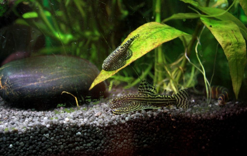 Кстати, мальки севеллий спесиоса 7 хвостиков, живы (т-т-т), жару нормально пережили и растут. Уже почти 3 см с хвостиком. А недавно разбирал 60 литровый гастромизятник и еще одного малька нашел, был как соринка, а сейчас уже 1,5 см, плавнички сформировались, весело ползает по стеклам, гранулы сухие грызет. А на второй фотке малек из первого нереста на листике и взрослая севеллия ленеолата.