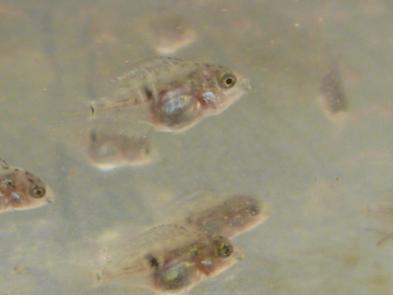Похвастаюсь и своими Мееками. Брала 2х мальками еще. Оказались 2 пацана. Подросли, так один начал гонять другого. Долго думала, что с ними делать. Решила обменять на девочку того, которого забивали (хоть и красивый, жалко). Обменяла. Недели 2 привыкали они друг к другу, пацан и самочке начал показывать кто в доме хозяин. Потом, прямо в один момент, смотрю в акву - мальчишка как на поводке за ней. А девочка аж расцвела - заиграла всеми красками, а он за ней хвост распушил, довольный. В общем, приручила она его. Выложили икру в кокос мне, а както прихожу домой - а там туча мальков с охраной в виде папы с мамой. Вся рыба по углам жмется. Хотя до этого все жили мирно. Мальков слила в отсадник. Сейчас подрастают, уже 1см.