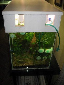Теперь о светильнике реанимационного аквариума. Материал - PVC 4 мм.На фотографиях, надеюсь виден принцип конструкции. Вентилятор обдува, решетка, и выходные отверстия для теплого воздуха. Лампы(СИЛЬВАНИЯ) работают на украинских ЭПРА уже год. Есть фото клея для PVC и вид на светильник(сверху) большой банки. Ранее он планировался как закрытый, но МГ сделал свое дело.Там на тех же ЭПРА стоят две лампы по 55 вт ОСРАМ ФЛОРА 77.