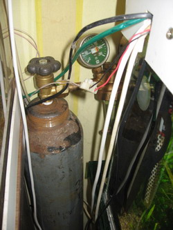 Бело-зеленый баллон(4литра) - лабораторный сейчас пустой, а химзавод вроде как прикрыли. На нем редуктор с игольчатым клапаном. Серый - медицинский на 10 литров с аналогичным редуктором. Также фото синего электромагнитного клапана от автомобиля и тороидального трансформатора ( для питания клапана) На зеленом баллоне присобачено два счетчика пузырьков из капельниц. И фото реактора. _ перевернытый колокол, а в него внизу заведен "выхлоп помпы".